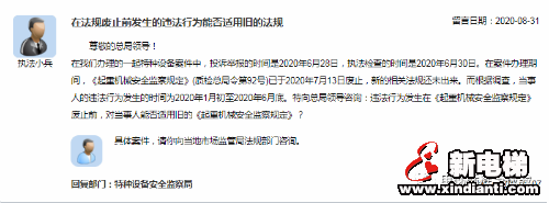 【內(nèi)容】在我們辦理的一起特種設(shè)備案件中,投訴舉報(bào)的時(shí)間是2020年6月28日,執(zhí)法檢查的時(shí)間是2020年6月30日。在案件辦理期間,《起重機(jī)械安全監(jiān)察規(guī)定》(質(zhì)檢總局令第92號(hào))已于2020年7月13日廢止,新的相關(guān)法規(guī)還未出來。而根據(jù)調(diào)查,當(dāng)事人的違法行為發(fā)生的時(shí)間為2020年1月初至2020年6月底。特向總局領(lǐng)導(dǎo)咨詢:違法行為發(fā)生在《起重機(jī)械安全監(jiān)察規(guī)定》廢止前,對當(dāng)事人能否適用舊的《起重機(jī)械安全監(jiān)察規(guī)定》?