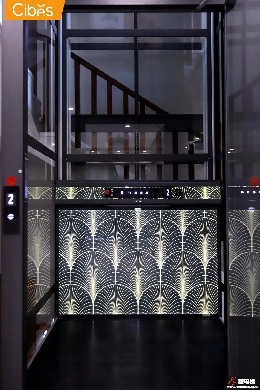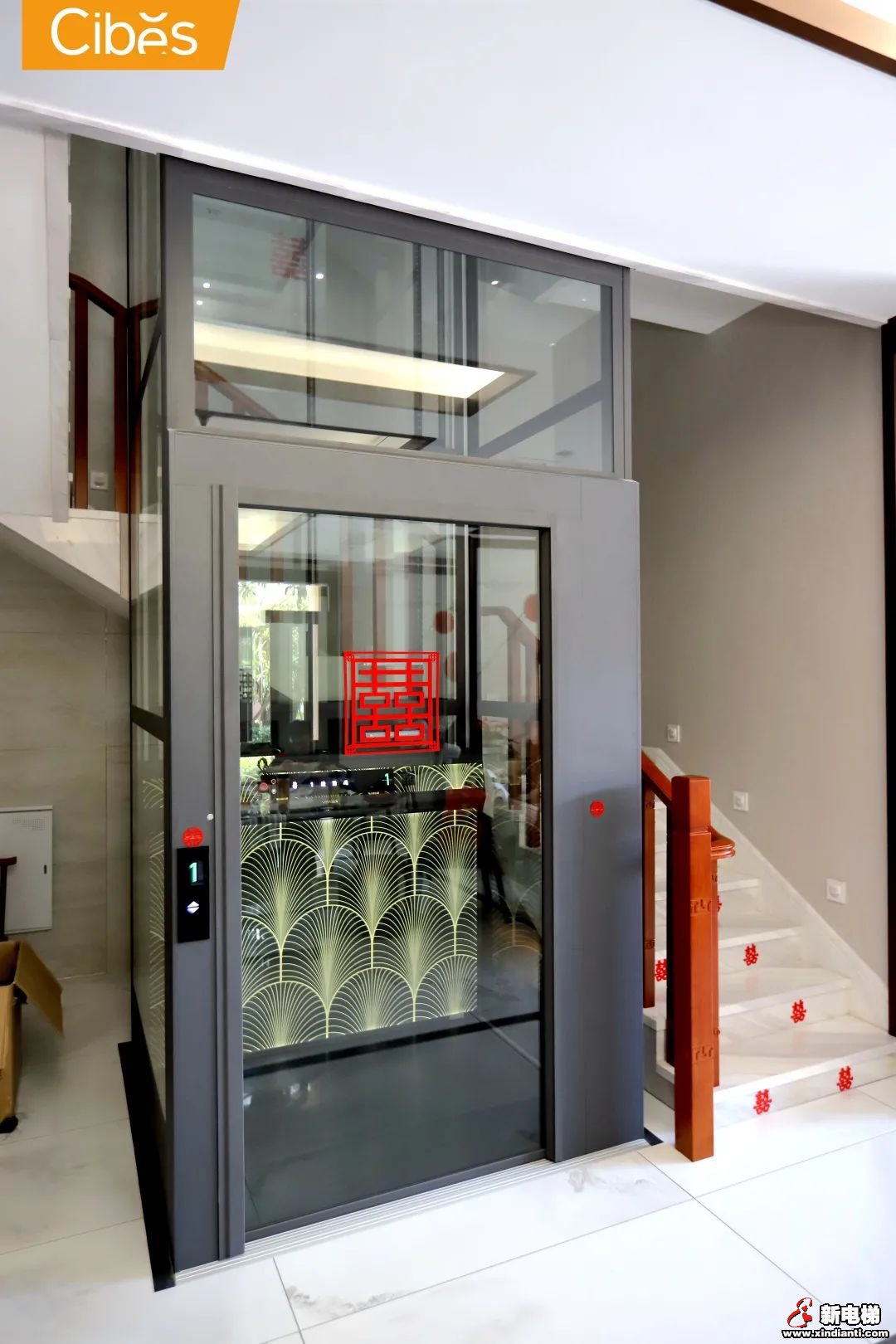 CIBES西柏思別墅電梯Voyager V80時(shí)尚版入駐新家:新居為新中式家裝風(fēng)格,繼承傳統(tǒng)中式的優(yōu)雅古樸,又帶有現(xiàn)代的簡(jiǎn)約幾何特色,而V80時(shí)尚版多樣背景圖案與多種井道色彩可供選擇,與家居環(huán)境完美融合: