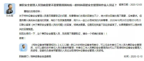 核心提示:關(guān)于特種設(shè)備安全管理人員是否需要取證的問題,我看看咱們總局的回復(fù)也不少,絕大部分回復(fù)的是不需要,沒有要求。但是我看從系統(tǒng)自動(dòng)查詢的回復(fù),有的個(gè)別回復(fù)是需要,另外從一些公眾號(hào)轉(zhuǎn)發(fā)的內(nèi)容看看,2020年10月28日總局對(duì)10月23日群眾留言《關(guān)于兼職安全管理人員的問題》的回復(fù),明確說需要。但是現(xiàn)在我查不到這條留言了。如果需要我可以提供相關(guān)的回復(fù)截圖。