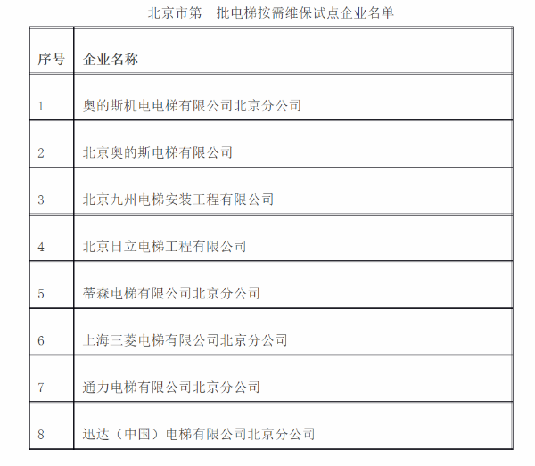 核心提示:近日,北京市市場(chǎng)監(jiān)督管理局公布了北京市第一批電梯按需維保和自行檢測(cè)試點(diǎn)企業(yè)名單。電梯按需維保名單包括:1奧的斯機(jī)電電梯有限公司北京分公司,2北京奧的斯電梯有限公司,3北京九州電梯安裝工程有限公司,4北京日立電梯工程有限公司,5蒂森電梯有限公司北京分公司,6上海三菱電梯有限公司北京分公司,7通力電梯有限公司北京分公司,8迅達(dá)(中國(guó))電梯有限公司北京分公司。自行檢測(cè)試點(diǎn)企業(yè)包括:上海三菱電梯有限公司北京分公司。