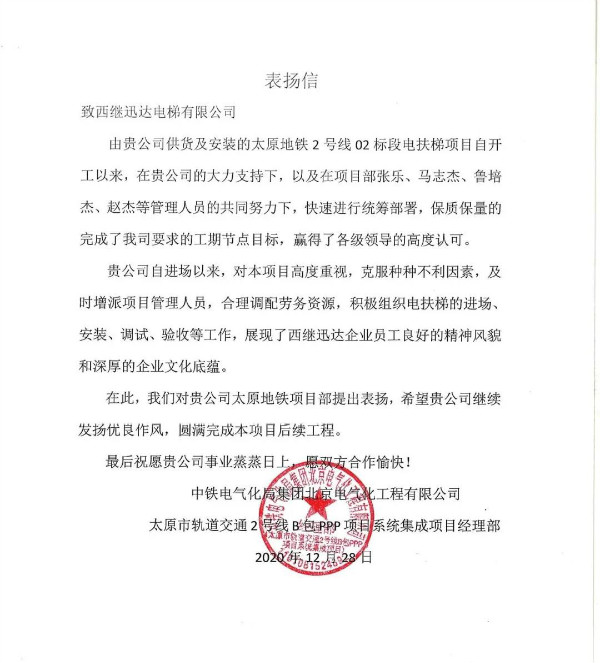 近日,西繼迅達(dá)收到了一封來(lái)自中鐵電氣化局集團(tuán)北京電氣化工程有限公司的表?yè)P(yáng)信,來(lái)自太原市軌道交通2號(hào)線項(xiàng)目經(jīng)理部的相關(guān)領(lǐng)導(dǎo)在信中表達(dá)了對(duì)公司項(xiàng)目負(fù)責(zé)人員的褒獎(jiǎng)和肯定,并希望公司能夠再接再厲,在之后的工作中能繼續(xù)發(fā)揚(yáng)良好的精神風(fēng)貌,圓滿完成項(xiàng)目后續(xù)工程!