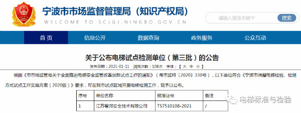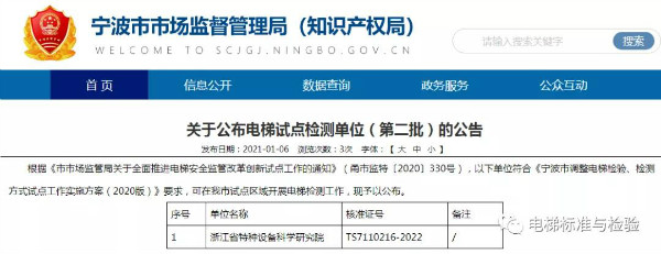 2021年伊始,根據(jù)《市市場(chǎng)監(jiān)管局關(guān)于全面推進(jìn)電梯安全監(jiān)管改革創(chuàng)新試點(diǎn)工作的通知》(甬市監(jiān)特〔2020〕330號(hào)),寧波市市場(chǎng)監(jiān)管局于1月4至11日一周內(nèi)相繼公布三批次電梯試點(diǎn)檢測(cè)單位名單!