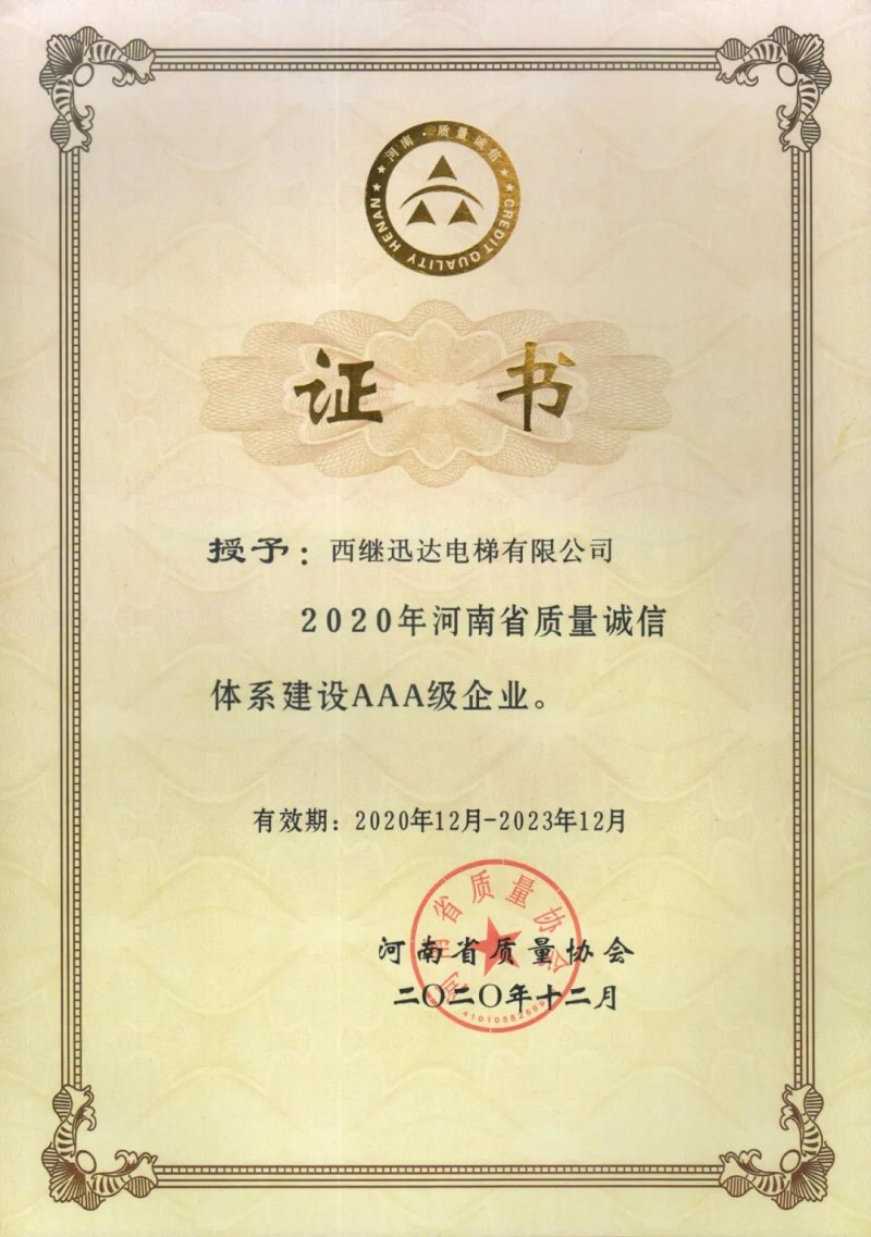 西繼迅達(dá)再次被認(rèn)定為省質(zhì)量誠(chéng)信AAA級(jí)企業(yè)