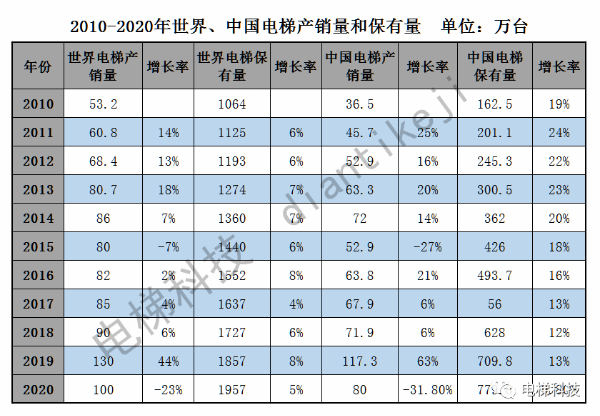 核心提示:根據(jù)總局和相關(guān)協(xié)會(huì)最新消息,2020年世界電梯產(chǎn)銷(xiāo)量達(dá)100萬(wàn)臺(tái),增長(zhǎng)率為-23%,世界電梯保有量達(dá)到了1957萬(wàn)臺(tái),增長(zhǎng)率為5%,而中國(guó)電梯2020年產(chǎn)銷(xiāo)量為80萬(wàn)臺(tái),增長(zhǎng)率為-31.8%,中國(guó)電梯保有量達(dá)到780萬(wàn)臺(tái),其中自動(dòng)扶梯數(shù)量達(dá)到了62.5萬(wàn)臺(tái),世界在用自動(dòng)扶梯達(dá)137萬(wàn)臺(tái),中國(guó)在用電梯占世界在用電梯近4成(39.86%),其中自動(dòng)扶梯占世界自動(dòng)扶梯近5成(45.6%)。