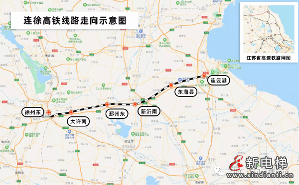 連徐高鐵,線路全長180km,此次江南嘉捷服務的項目東起連云港站(連接連鹽鐵路和連淮揚鎮(zhèn)城際鐵路),途徑東海站、新沂南站、邳州東站、大許南站,西至徐州站(連接鄭徐客運專線、京滬高速鐵路、徐宿淮鹽鐵路)。全線于2017年7月開工,2021年1月8日試運行,2021年2月8日開通運營。