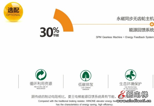 菱王電梯采用新一代智慧控制系統(tǒng),采用永磁同步無齒輪主機,運用智能變頻技術(shù),通過能源回饋系統(tǒng),來減少電梯少消耗電能,達到循環(huán)利用資源,低碳環(huán)保,生態(tài)環(huán)境保護功能。