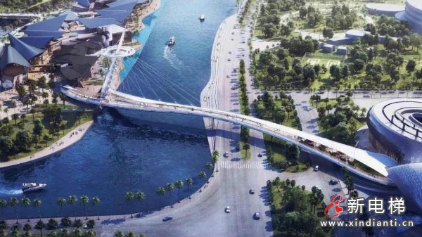 它就是三亞海棠灣河心島景觀橋,其位于河心島東南側(cè),跨越人工河主航道及海棠北路,是連接三亞國際免稅城一期和二期的一座人行專用通道橋。
