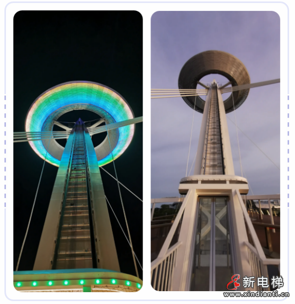 萊茵電梯為景觀橋量身設(shè)計并安裝了一臺傾斜角度為60°的斜行電梯,運行斜長46.2米,垂直提升高度為40米。