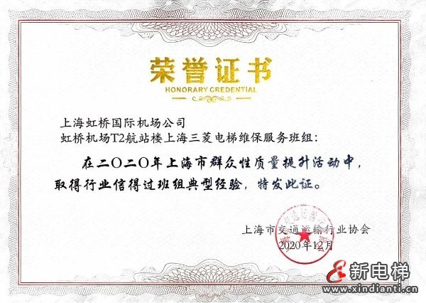 上海三菱虹橋機(jī)場T2航站樓維保服務(wù)班組榮獲2020年上海市群眾性質(zhì)量提升,行業(yè)質(zhì)量信得過班組稱號。上海三菱電梯很榮幸能為虹橋機(jī)場和各位乘客提供專業(yè)、優(yōu)質(zhì)的服務(wù)。這項(xiàng)榮譽(yù)是用戶對我們服務(wù)的肯定,也將是我們持續(xù)進(jìn)步的動力。