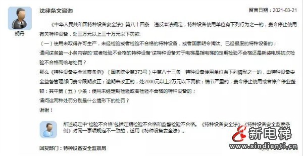 【網(wǎng)友提問】使用未取得許可生產(chǎn),未經(jīng)檢驗(yàn)或者檢驗(yàn)不合格的特種設(shè)備該特種設(shè)備對于電梯是指電梯的定期檢驗(yàn)不合格還是新裝電梯初次檢驗(yàn)不合格而給與處罰?使用未經(jīng)定期檢驗(yàn)或者檢驗(yàn)不合格的特種設(shè)備的;請問這兩種處罰分別是什么情形下的處罰?