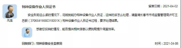 【內(nèi)容】安全形勢這么緊的情況下,花錢就能辦特種設(shè)備作業(yè)人員證,這樣的該怎么處理,請查清長春市市場監(jiān)督管理局許可王忠毅(37068419880318051X)特種設(shè)備作業(yè)人員證書過程,要求處理結(jié)果。