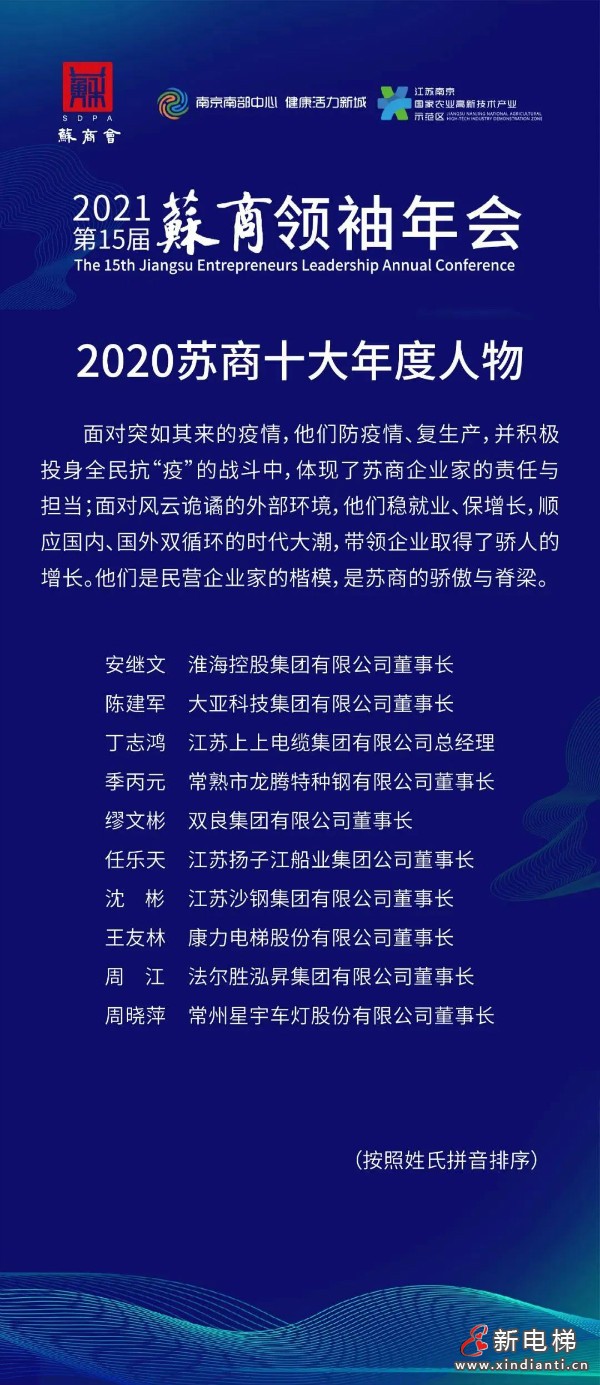 為表彰在江蘇疫情防控事業(yè)和經(jīng)濟(jì)社會(huì)發(fā)展的突出貢獻(xiàn),蘇商會(huì)向康力電梯董事長(zhǎng)王友林、沙鋼集團(tuán)董事長(zhǎng)沈彬等10位江蘇優(yōu)秀企業(yè)家頒發(fā)“2020蘇商十大年度人物”獎(jiǎng)。