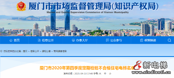 2021年4月13日 廈門市市場監(jiān)督管理局網(wǎng)站發(fā)布了廈門市2020年第四季度定期檢驗不合格住宅電梯名單。本次定期檢驗的總體情況為:廈門市2020年第四季度共完成住宅電梯定期檢驗4492臺,涉及住宅(樓盤)小區(qū)412個,檢驗合格(含復(fù)檢合格)4483臺,檢驗不合格9臺,檢驗合格率99.79%。其中,存在日常管理問題的9臺,設(shè)備本體問題的0臺,同時存在日常管理問題和設(shè)備本體問題的0臺。