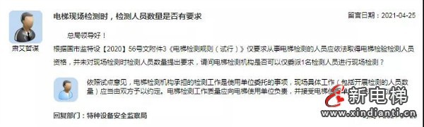 【總局回復】依照試點意見,電梯檢測機構承擔的檢測工作是使用單位委托的事項,現(xiàn)場具體工作(包括開展檢測的人員數(shù)量)應當由雙方予以約定。電梯檢測工作質量應向電梯使用單位負責,并接受電梯使用單位和使用者的監(jiān)督。