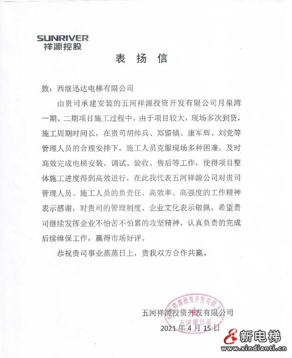 近日,一封來自祥源控股集團五河祥源投資開發(fā)有限公司的表揚信送到了西繼迅達電梯。相關領導在信中對西繼迅達項目團隊和安裝工人給予了高度贊揚、對公司的項目負責人員表示感謝,并希望在后續(xù)工作中能繼續(xù)發(fā)揮企業(yè)不怕苦不怕累的攻堅精神!
