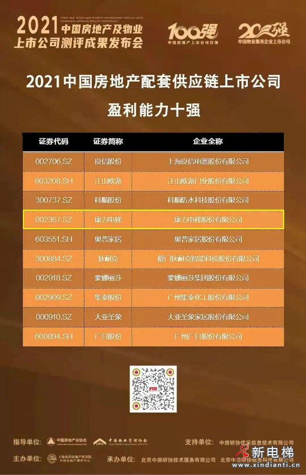 引領行業(yè)高質量發(fā)展 | 康力電梯榮獲“2021中國房地產(chǎn)供應鏈上市公司盈利能力10強”
