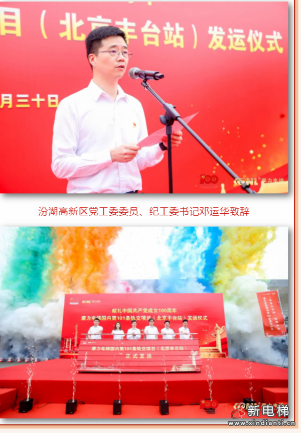 汾湖高新區(qū)黨工委委員、紀(jì)工委書記鄧運(yùn)華在致辭中充分肯定康力電梯24年來(lái)創(chuàng)新拼搏取得的扎實(shí)業(yè)績(jī),對(duì)今天康力電梯獻(xiàn)禮中國(guó)共產(chǎn)黨成立100周年,國(guó)內(nèi)第101條軌交項(xiàng)目(北京豐臺(tái)站)發(fā)運(yùn)儀式表示熱烈祝賀。
