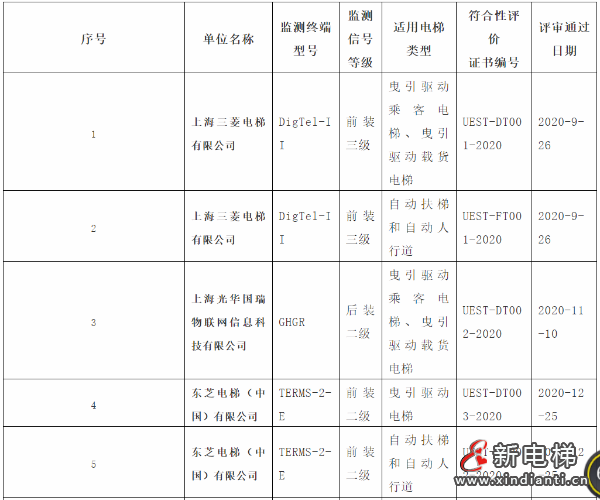 上海市聯(lián)合電梯安全技術(shù)促進(jìn)中心受上海市市場(chǎng)監(jiān)督管理局(原上海市質(zhì)量技術(shù)監(jiān)督局)委托,自2019年起,對(duì)電梯配備具有運(yùn)行參數(shù)采集和網(wǎng)絡(luò)遠(yuǎn)程傳輸功能的監(jiān)測(cè)裝置開(kāi)展了對(duì)標(biāo)符合性評(píng)價(jià)工作。至今,已經(jīng)通過(guò)上海市地方標(biāo)準(zhǔn)DB/T 1123-2018《智慧電梯監(jiān)測(cè)終端技術(shù)要求》符合性評(píng)審的名單公布,包含上海三菱以及東芝電梯等企業(yè)。