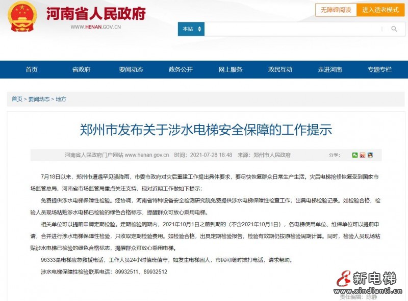 鄭州市市場監(jiān)管局發(fā)布關(guān)于涉水電梯安全保障的工作提示
