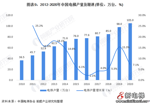 在城鎮(zhèn)化持續(xù)發(fā)展、基礎(chǔ)設(shè)施投資建設(shè)和舊樓加裝電梯等動力推動下,電梯行業(yè)產(chǎn)量逐漸增多。根據(jù)中國電梯協(xié)會數(shù)據(jù),2020年我國電梯產(chǎn)量達(dá)到105萬臺,增長7.1%。