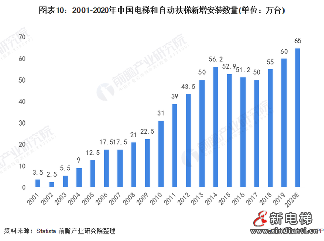 根據(jù)Statista的統(tǒng)計(jì)數(shù)據(jù)顯示,2001-2019年,中國電梯和自動扶梯新增安裝數(shù)量呈現(xiàn)波動上漲趨勢,2019年電梯和自動扶梯新增安裝數(shù)量為60萬臺。結(jié)合歷史新裝數(shù)量數(shù)據(jù)及保有量新增數(shù)量初步測算,2020年中國電梯和自動扶梯的新裝數(shù)量約為65萬臺。