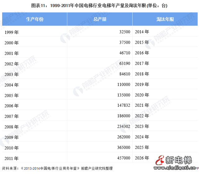 一般而言,三菱、日立等日本電梯的報(bào)廢年限約在15年,奧的斯、迅達(dá)、通力等歐美電梯的報(bào)廢年限在25年。由于我國電梯大部分標(biāo)準(zhǔn)都是參照日本標(biāo)準(zhǔn)設(shè)定,電梯報(bào)廢年限也在15年左右。隨著在用電梯使用壽命臨近,預(yù)計(jì)未來舊梯更新需求將進(jìn)一步增加。根據(jù)中國電梯行業(yè)商務(wù)年鑒統(tǒng)計(jì)數(shù)據(jù),我國電梯的產(chǎn)銷量及淘汰年限如下表所示: