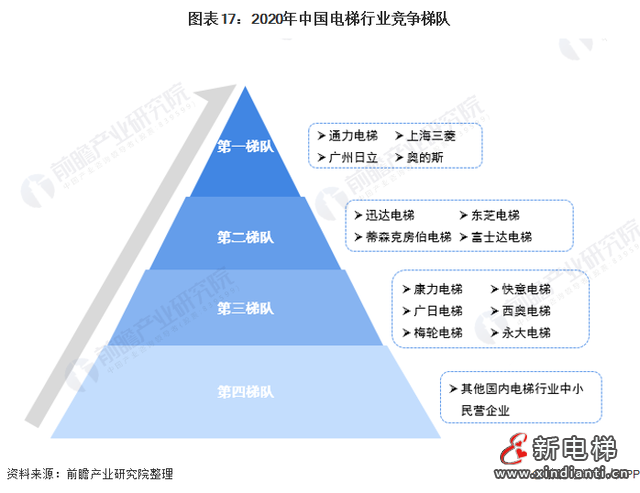 綜合各品牌在中國市場的研發(fā)能力、產(chǎn)品質(zhì)量、服務(wù)水平和顧客滿意度等表現(xiàn),中國電梯行業(yè)競爭企業(yè)可分為四個(gè)梯隊(duì),以通力、日立以及奧的斯為代表的老牌外資電梯企業(yè)仍然領(lǐng)銜國內(nèi)電梯市場,與上海電機(jī)的上海三菱并為第一梯隊(duì);迅達(dá)電梯、東芝電梯、蒂森電梯、富士達(dá)電梯等外資品牌的客戶管理精細(xì)程度相對較弱,位于第二梯隊(duì);永大電梯、康力電梯、西奧電梯等本土電梯企業(yè)產(chǎn)品成為民族品牌電梯代表,發(fā)展勢頭強(qiáng)勁,位于第三梯隊(duì);其他國內(nèi)電梯行業(yè)的中小企業(yè)位于第四梯隊(duì)。