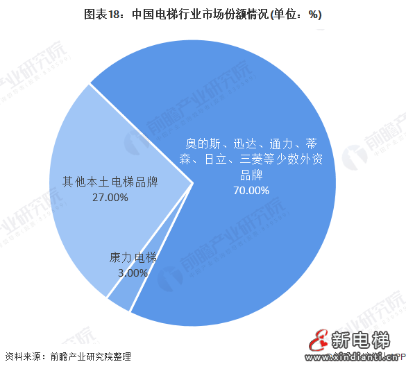 根據(jù)同力日升公司于2021年發(fā)布的招股說明書中數(shù)據(jù)顯示,我國電梯行業(yè)市場集中度較高,奧的斯、迅達(dá)、通力、蒂森、日立、三菱等少數(shù)外資品牌占據(jù)了國內(nèi)市場約70%的份額。本土電梯品牌的市場占有率約30%。在國產(chǎn)本土品牌中,康力電梯整梯業(yè)務(wù)占比超80%,2020年電梯銷量近3萬臺,國內(nèi)市占率約3%。