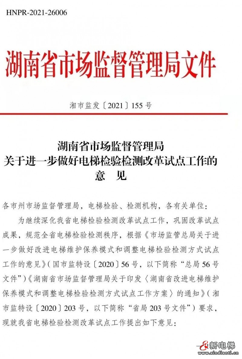 湖南省市場(chǎng)監(jiān)督管理局關(guān)于進(jìn)一步做好電梯檢驗(yàn)檢測(cè)改革試點(diǎn)工作的意見
