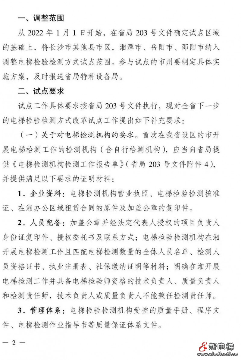 為繼續(xù)深化我省電梯檢驗(yàn)檢測(cè)改革試點(diǎn)工作,鞏固改革試點(diǎn)成果,規(guī)范全省電梯檢驗(yàn)檢測(cè)秩序,根據(jù)《市場(chǎng)監(jiān)管總局關(guān)于進(jìn)步做好改進(jìn)電梯維護(hù)保養(yǎng)模式和調(diào)整電梯檢驗(yàn)檢測(cè)方式試點(diǎn)工作的意見》(國(guó)市監(jiān)特設(shè)[2020]56號(hào),以下簡(jiǎn)稱“總局56號(hào)文件”)《湖南省市場(chǎng)監(jiān)督管理局關(guān)于印發(fā)<湖南省改進(jìn)電梯維護(hù)保養(yǎng)模式和調(diào)整電梯檢驗(yàn)檢測(cè)方式試點(diǎn)工作方案)的通知》(湘市監(jiān)特設(shè)[2020]203號(hào),以下簡(jiǎn)稱“省局203號(hào)文件”)要求,現(xiàn)就我省申梯檢驗(yàn)檢測(cè)改革試點(diǎn)工作提出如下意見:
