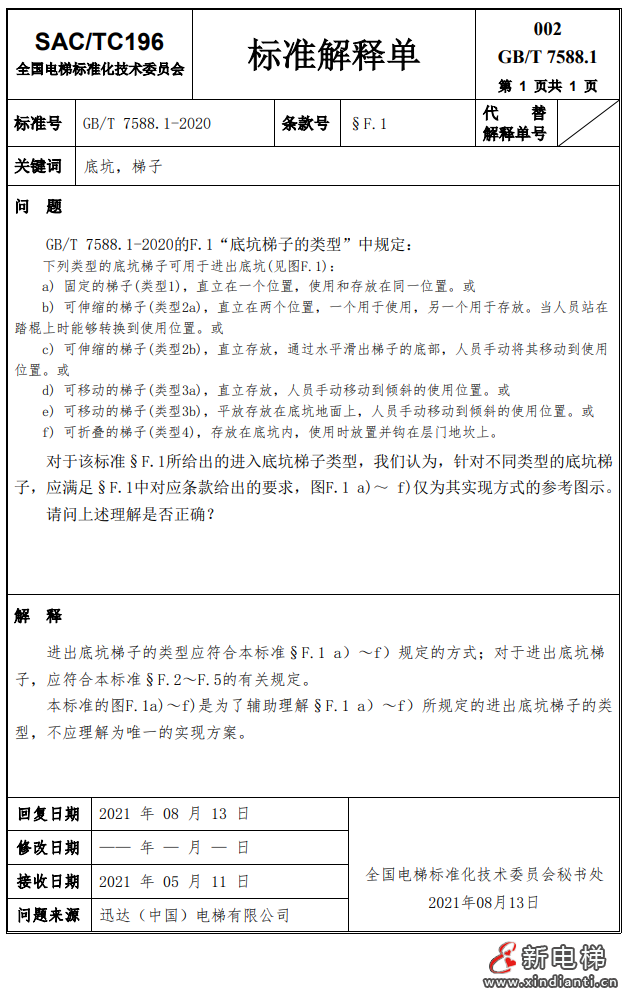 當(dāng)前位置:首頁>電梯資訊 >電梯法規(guī)Laws and Regulations>關(guān)于發(fā)布GB/T 7588.1-2020第3至5號(hào)解釋單的通知