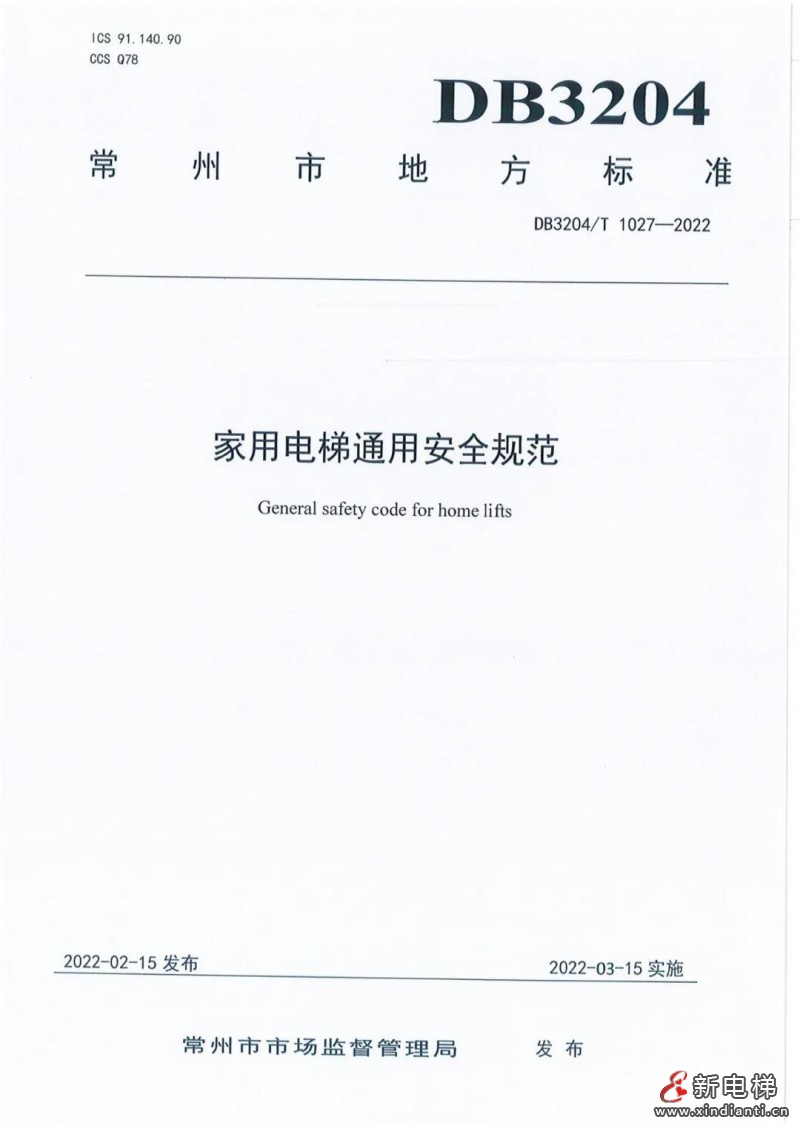 常州市地方標(biāo)準(zhǔn)《家用電梯通用安全規(guī)范》(DB3204/T 1027-2022)于2022年2月15日正式發(fā)布,將自2022年3月15日起實(shí)施。