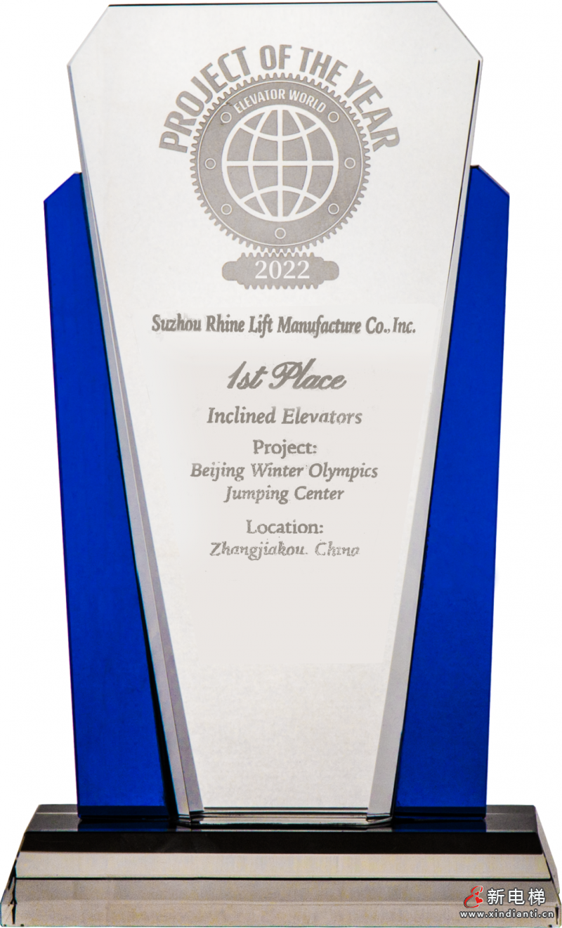 電梯世界(Elevator World)2022年度工程大賽(Project of the Year 2022)中,國家跳臺滑雪中心斜行電梯項目脫穎而出,斬獲一等金獎,這也是萊茵電梯第四次獲此殊榮。