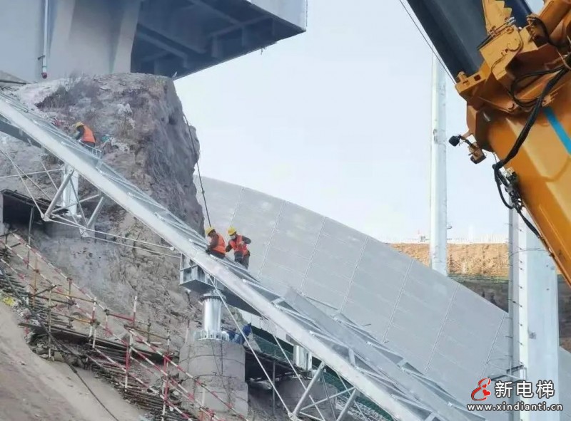 本項目是國內(nèi)第一例變軌跡運行的斜行電梯,中間有一段圓弧形軌道,坡度最緩處22.56°,最陡處39.56°。