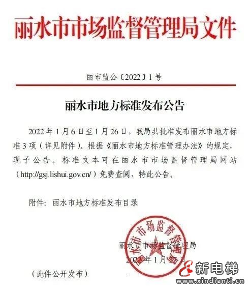 核心提示:2022年1月6日,麗水市市場監(jiān)督管理局批準(zhǔn)發(fā)布了市地方標(biāo)準(zhǔn)《電梯維護(hù)保養(yǎng)NFC應(yīng)用技術(shù)規(guī)范》,標(biāo)準(zhǔn)編號為DB3311/T 208─2022,并于2022年2月6日實(shí)施。