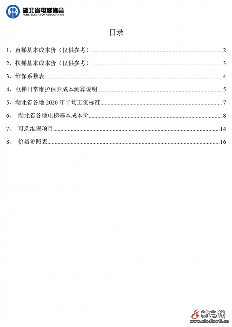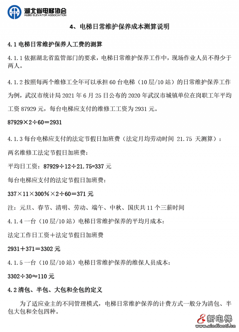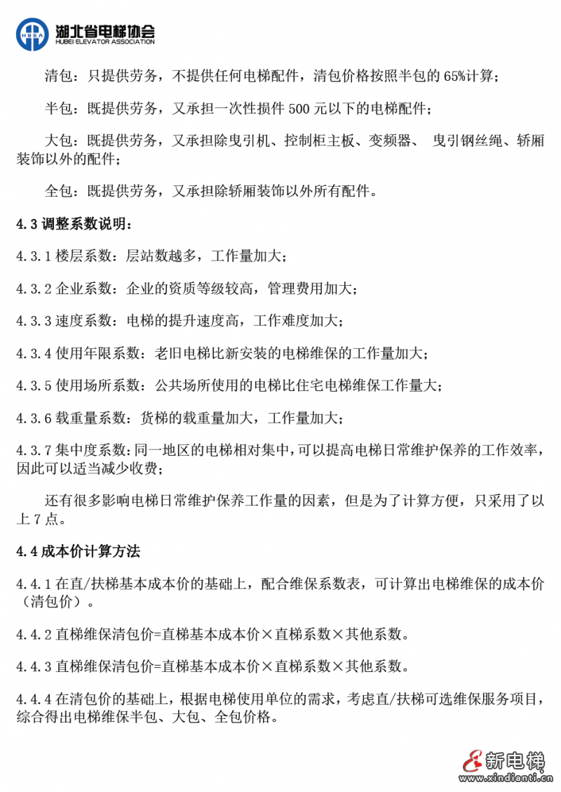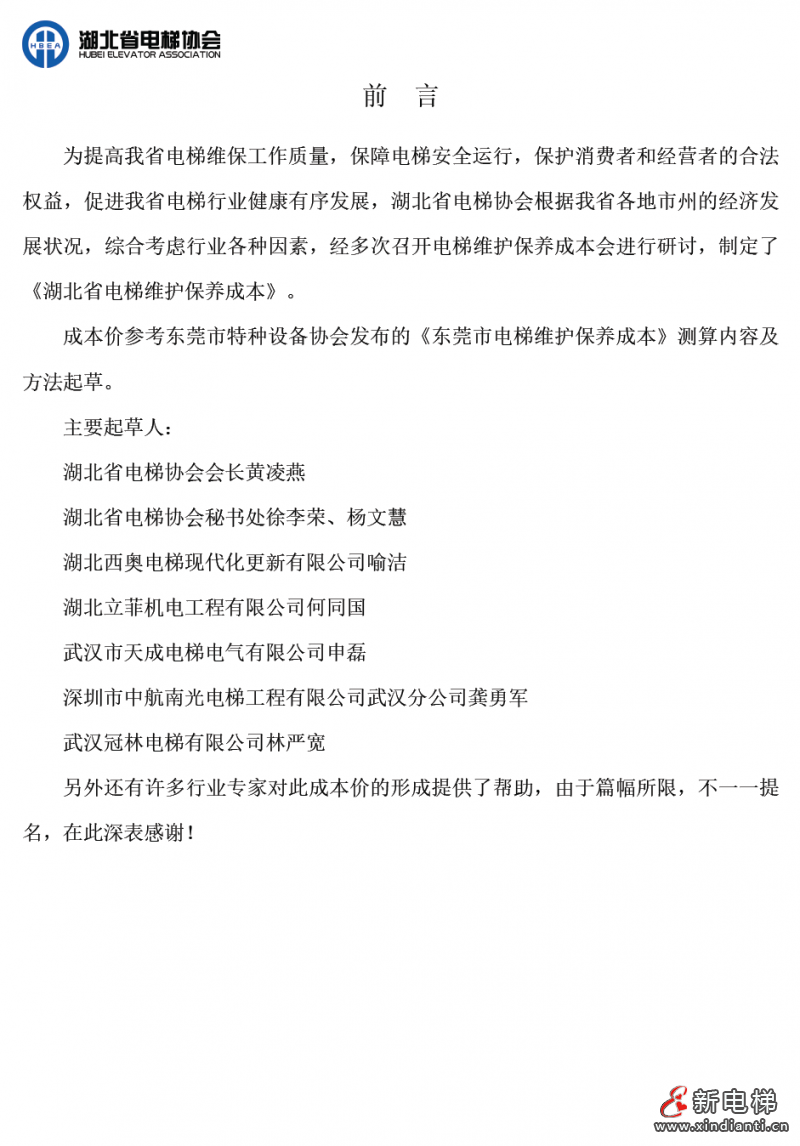 為提高我省電梯維保工作質(zhì)量,保障電梯安全運行,保護消費者和經(jīng)營者的合法權益,促進我省電梯行業(yè)健康有序發(fā)展,湖北省電梯協(xié)會根據(jù)我省各地市州的經(jīng)濟發(fā)展狀況,綜合考慮行業(yè)各種因素,經(jīng)多次召開電梯維護保養(yǎng)成本會進行研討,制定了《湖北省電梯維護保養(yǎng)成本》。成本價參考東莞市特種設備協(xié)會發(fā)布的《東莞市電梯維護保養(yǎng)成本》測算內(nèi)容及方法起草。