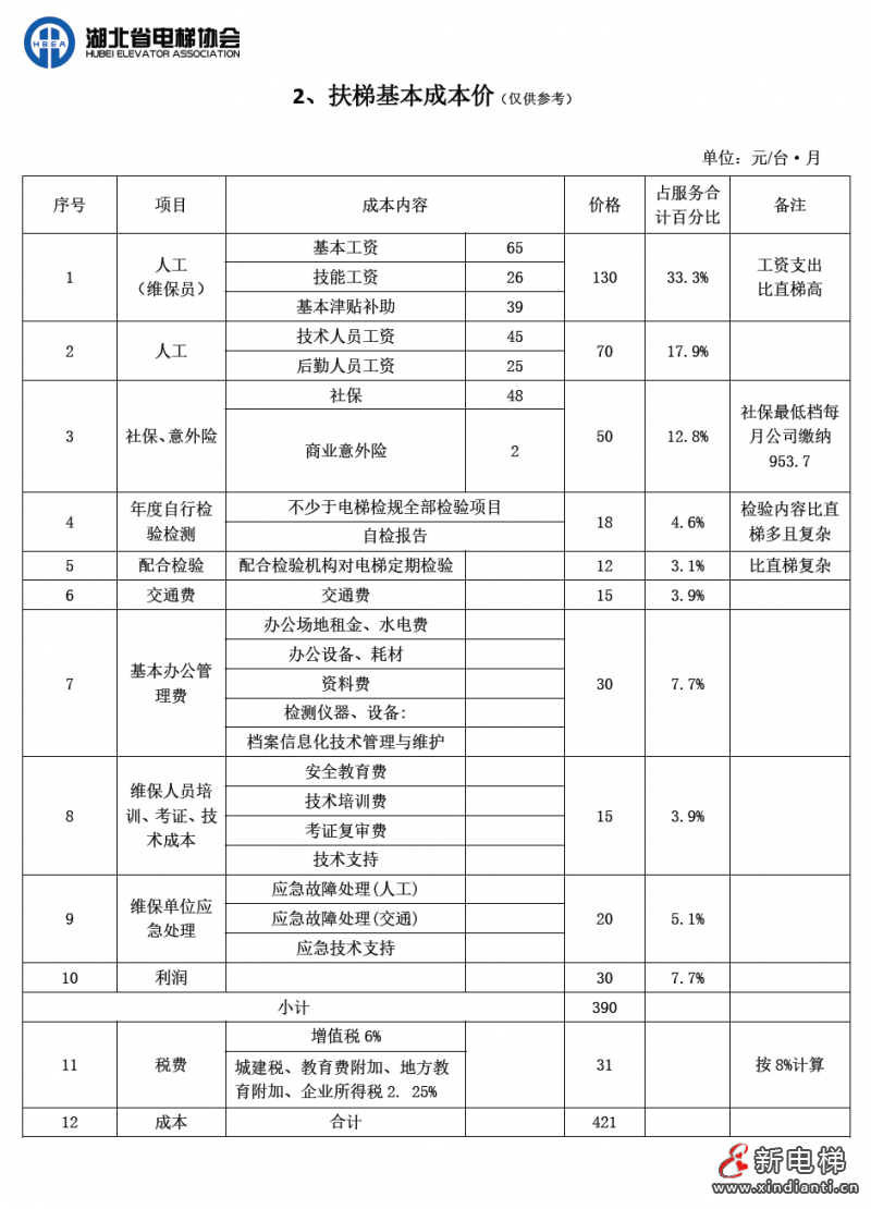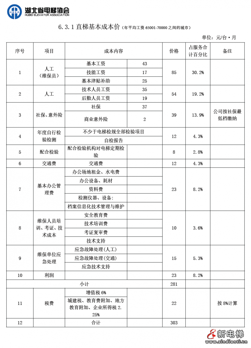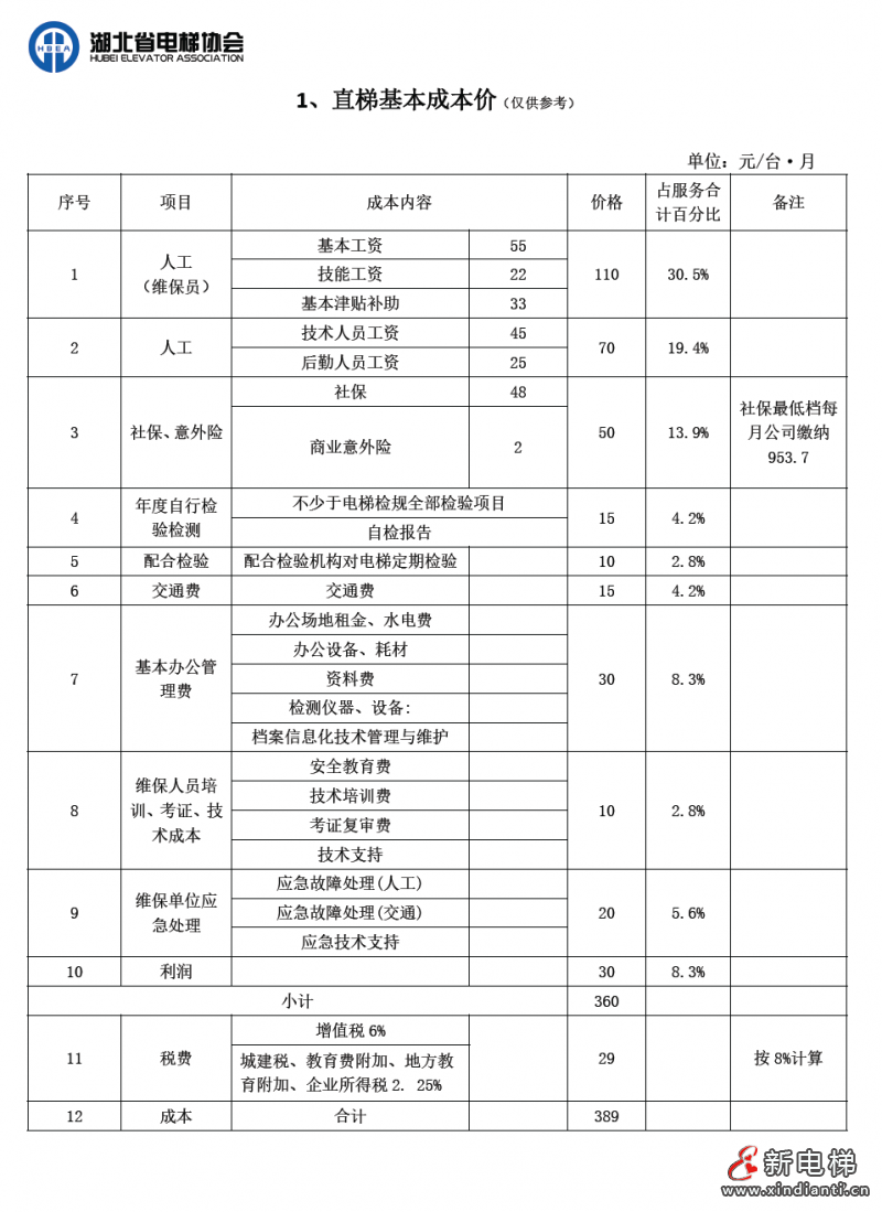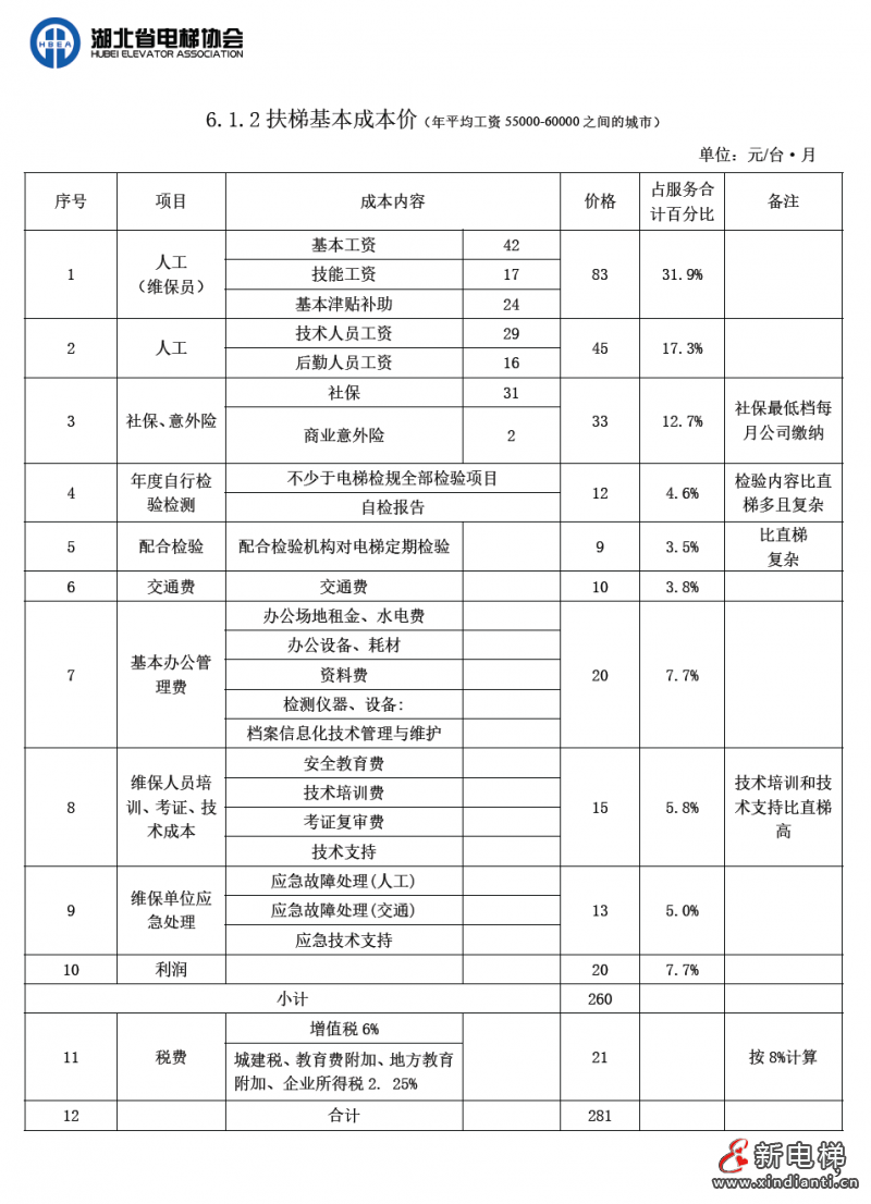 為提高我省電梯維保工作質(zhì)量,保障電梯安全運行,保護消費者和經(jīng)營者的合法權益,促進我省電梯行業(yè)健康有序發(fā)展,湖北省電梯協(xié)會根據(jù)我省各地市州的經(jīng)濟發(fā)展狀況,綜合考慮行業(yè)各種因素,經(jīng)多次召開電梯維護保養(yǎng)成本會進行研討,制定了《湖北省電梯維護保養(yǎng)成本》。成本價參考東莞市特種設備協(xié)會發(fā)布的《東莞市電梯維護保養(yǎng)成本》測算內(nèi)容及方法起草。