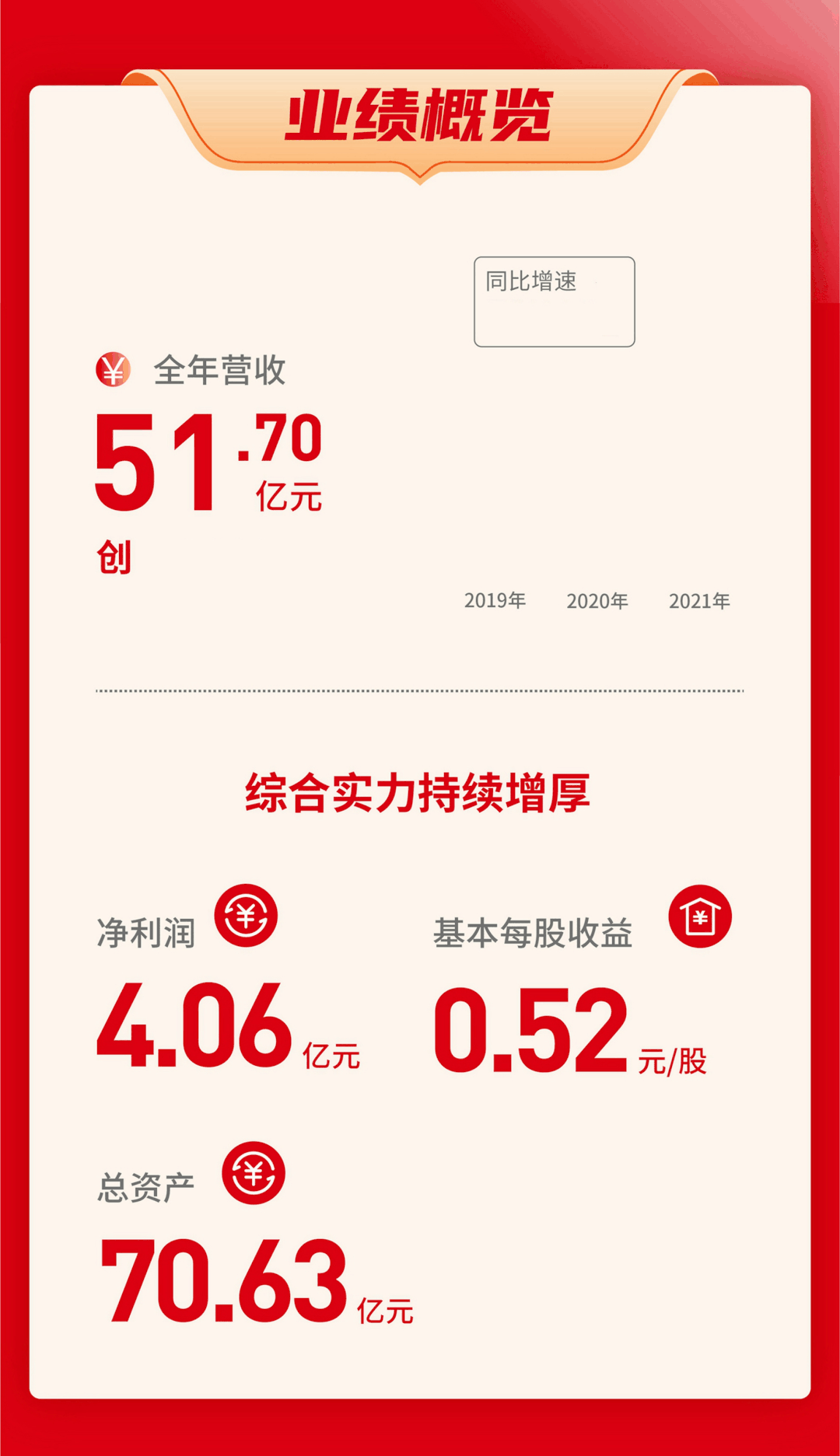 業(yè)績(jī)概覽:全年?duì)I收51.7億元,創(chuàng)歷史新高,同比增速20.70%。綜合實(shí)力持續(xù)增厚:凈利潤(rùn)4.06億元,基本每股收益0.52元/股,總資產(chǎn)70.63億元。
