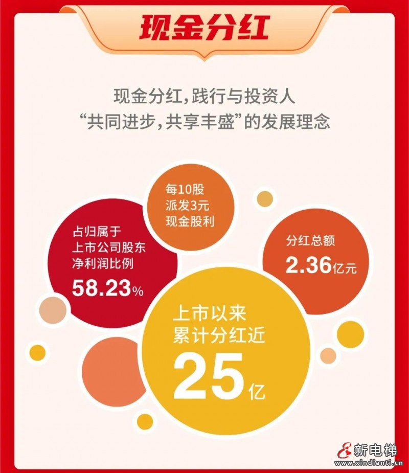 現(xiàn)金分紅:現(xiàn)金分紅,踐行投資人“共同進(jìn)步,共享豐盛”的發(fā)展理念。每股派發(fā)3元現(xiàn)金股利。分紅總額2.36億元,占?xì)w屬于上市公司股東凈利潤(rùn)比例58.23%。上市以來(lái)累計(jì)分紅25億元。