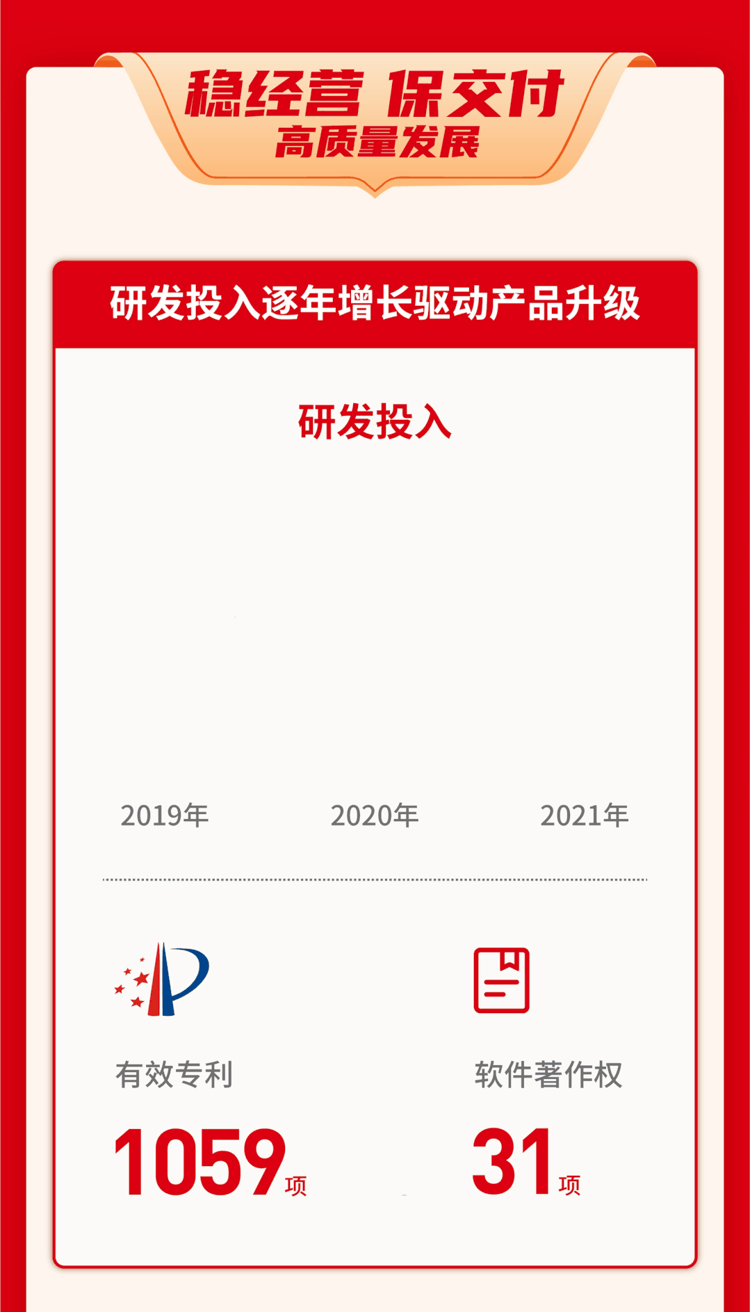 穩(wěn)經(jīng)營(yíng)、保交付,高質(zhì)量發(fā)展。研發(fā)投入逐年增長(zhǎng)驅(qū)動(dòng)產(chǎn)品升級(jí)。研發(fā)投入2019年1.5億元,2020年1.8億元,2021年2.02億元。有效專利1059項(xiàng),軟件著作權(quán)31項(xiàng)。
