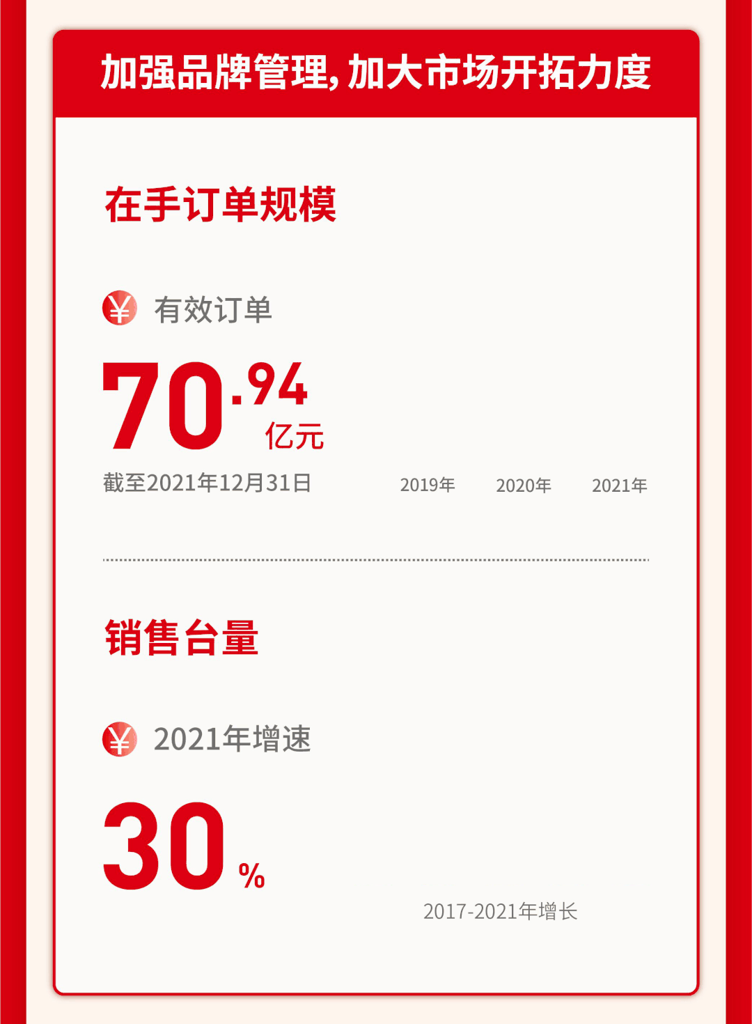 加強(qiáng)品牌管理,加大市場(chǎng)開拓力度。截至2021年底有效訂單70.94億元。銷售臺(tái)量2021年增速30%。