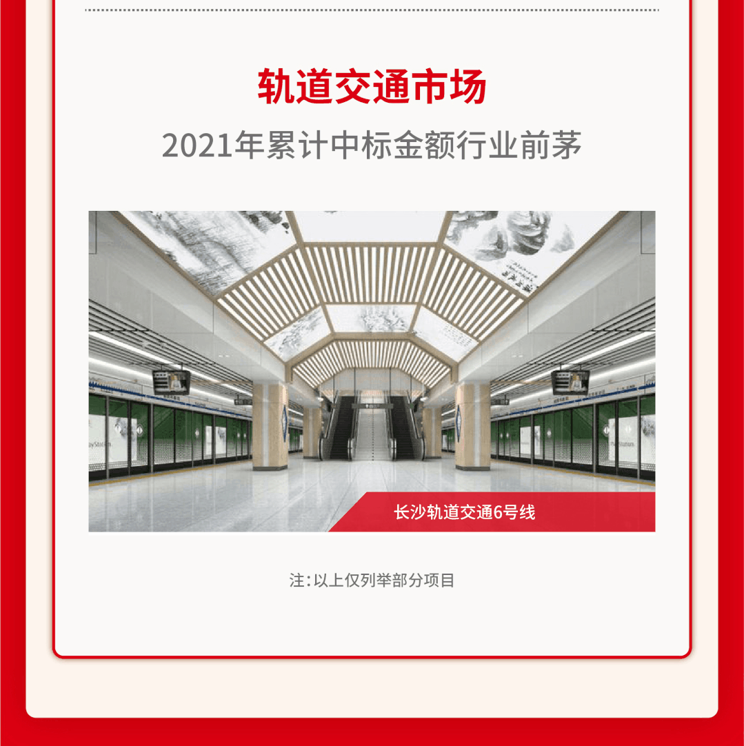 軌交市場(chǎng):2021年累計(jì)中標(biāo)金額行業(yè)前茅。天津地鐵11號(hào)線,湖州至杭州西至杭黃高鐵連接線, 重慶軌道交通4號(hào)線,長(zhǎng)沙軌道交通6號(hào)線, 蘇州軌道交通S1線