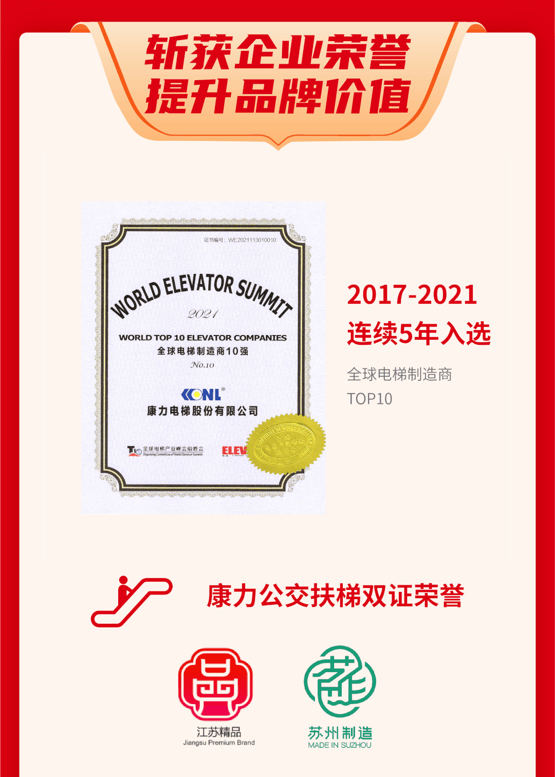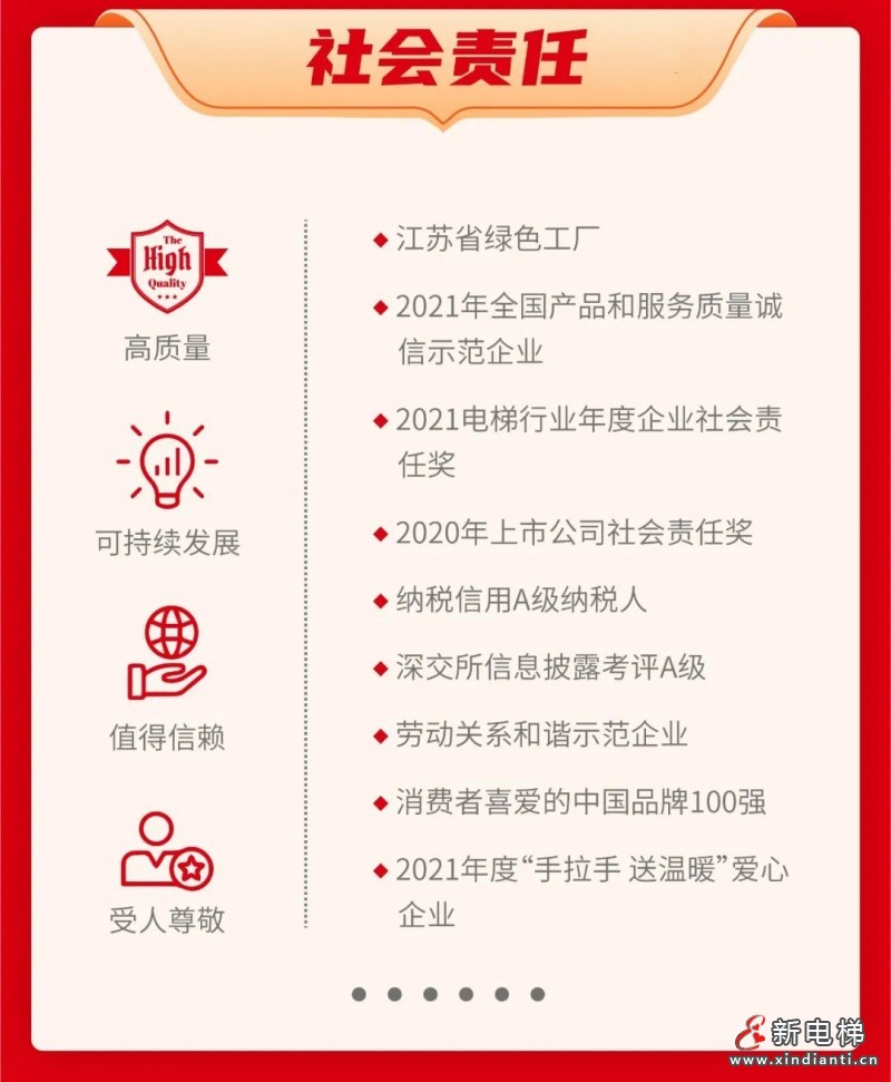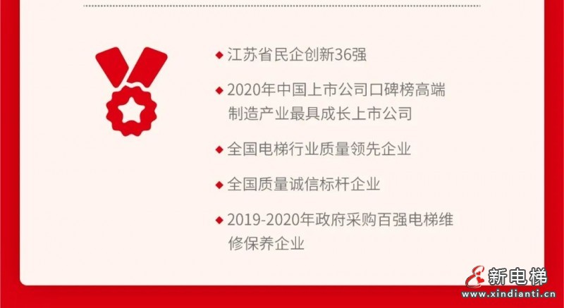 斬獲企業(yè)榮譽(yù)、提升品牌價(jià)值。2013-2021年連續(xù)9年躋身房地產(chǎn)開發(fā)綜合實(shí)力TOP500首選供應(yīng)商.電梯類;全國(guó)質(zhì)量標(biāo)桿獎(jiǎng);2017-2021年連續(xù)5年入選全球電梯制造商TOP10;2021年品牌價(jià)值79.18億元??盗环鎏蓦p證榮譽(yù)(江蘇精品、蘇州制造)。江蘇省民企創(chuàng)新36強(qiáng);2020年中國(guó)上市公司口碑高端制造產(chǎn)業(yè)最具成長(zhǎng)上市公司;全國(guó)電梯行業(yè)質(zhì)量領(lǐng)先企業(yè);全國(guó)質(zhì)量誠(chéng)信標(biāo)桿企業(yè);2019-202年政府采購(gòu)百?gòu)?qiáng)電梯維修保養(yǎng)企業(yè)。