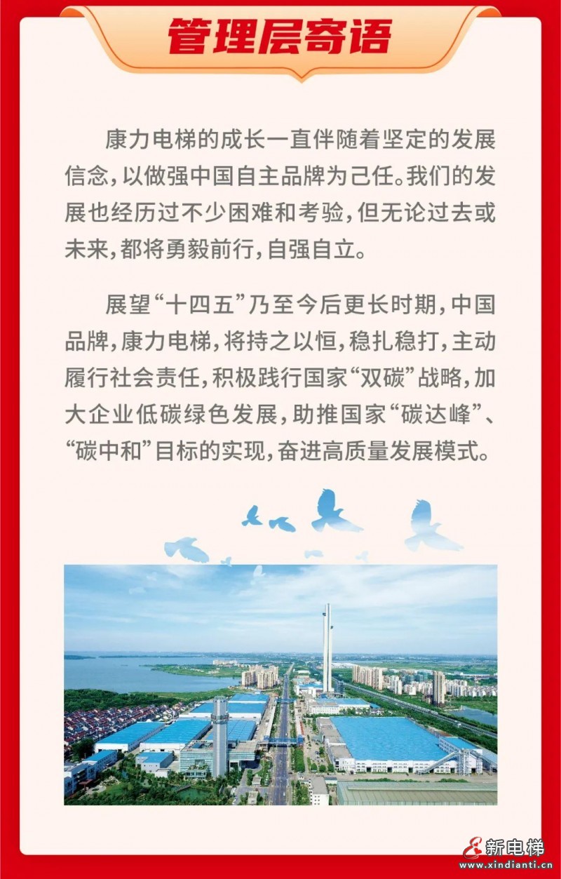 展望“十四五”乃至今后更長(zhǎng)時(shí)期,中國(guó)品牌,康力電梯,將持之以恒,穩(wěn)扎穩(wěn)打,主動(dòng)履行社會(huì)責(zé)任,積極踐行國(guó)家“雙碳”戰(zhàn)略,大企業(yè)低碳綠色發(fā)展,助推國(guó)家“碳達(dá)峰”、“碳中和”目標(biāo)的實(shí)現(xiàn),奮進(jìn)高質(zhì)量發(fā)展模式。