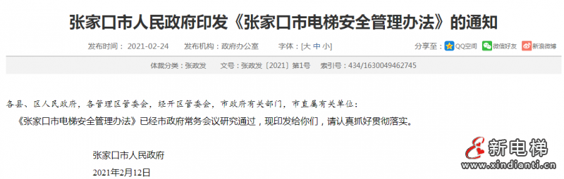 張家口市人民政府印發(fā)《張家口市電梯安全管理辦法》的通知