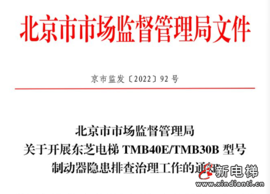 北京市市場(chǎng)監(jiān)督管理局發(fā)布關(guān)于開(kāi)展東芝電梯 TMB40E/TMB30B 型號(hào)制動(dòng)器隱患排查治理工作的通知,為進(jìn)一步加強(qiáng)電梯安全監(jiān)管,扎實(shí)做好電梯鼓式制動(dòng)器專(zhuān)項(xiàng)隱患排查治理,消除事故隱患,根據(jù)近期全市電梯檢驗(yàn)和日常監(jiān)管工作中反映的有關(guān)問(wèn)題,市市場(chǎng)監(jiān)管局決定在全市范圍內(nèi)開(kāi)展東芝電梯 TMB40E/TMB30B 型號(hào)制動(dòng)器隱患排查治理工作。排查治理對(duì)象本次排查治理對(duì)象為使用 TMB40E/TMB30B 型號(hào)制動(dòng)器的東芝電梯,該型號(hào)制動(dòng)器主要用于東芝 TM40E/TM30B 型號(hào)曳引機(jī)。