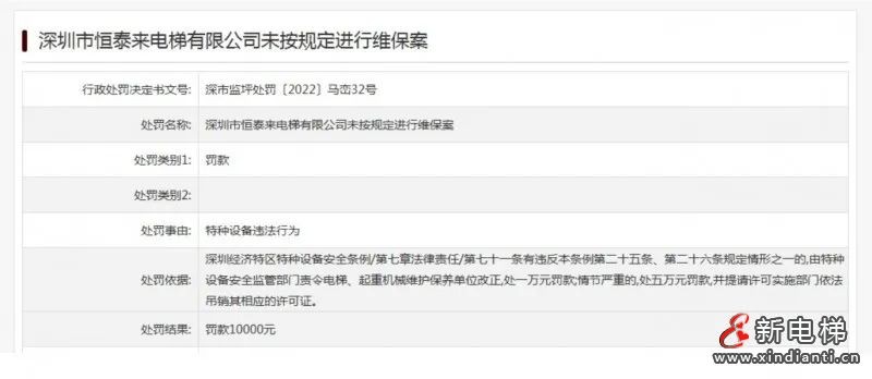 深圳市市場(chǎng)監(jiān)督管理局網(wǎng)站公布一則行政處罰決定書(shū)。深圳市恒泰來(lái)電梯有限公司因未按規(guī)定進(jìn)行維保被市場(chǎng)監(jiān)管部門(mén)處罰。處罰事由為:特種設(shè)備違法行為。罰款10000元。處罰依據(jù)為:深圳經(jīng)濟(jì)特區(qū)特種設(shè)備安全條例/第七章法律責(zé)任/第七十一條有違反本條例第二十五條、第二十六條規(guī)定情形之一的,由特種設(shè)備安全監(jiān)管部門(mén)責(zé)令電梯、起重機(jī)械維護(hù)保養(yǎng)單位改正,處一萬(wàn)元罰款;情節(jié)嚴(yán)重的,處五萬(wàn)元罰款,并提請(qǐng)?jiān)S可實(shí)施部門(mén)依法吊銷(xiāo)其相應(yīng)的許可證。處罰決定日期為2022年9月5日。深圳市恒泰來(lái)電梯有限公司法定代表人(負(fù)責(zé)人)為謝靈。