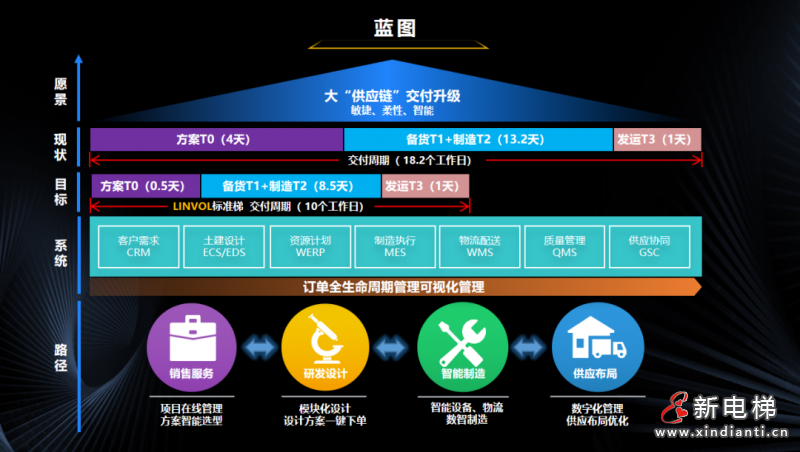 除了全面融入數字化技術的電梯產品,為了更完善地為用戶提供全生命周期服務,美的LINVOL數智電梯“大供應鏈”產線也進行了全面升級,以“敏捷、柔性、智能”為目標,從銷售服務、研發(fā)設計、智能制造到供應布局,全方位推進產線模型化生產及全流程工藝優(yōu)化,充分釋放產線潛能,標準梯交付周期從18.2個工作日縮短至10個工作日,跑出電梯行業(yè)加“數”度。