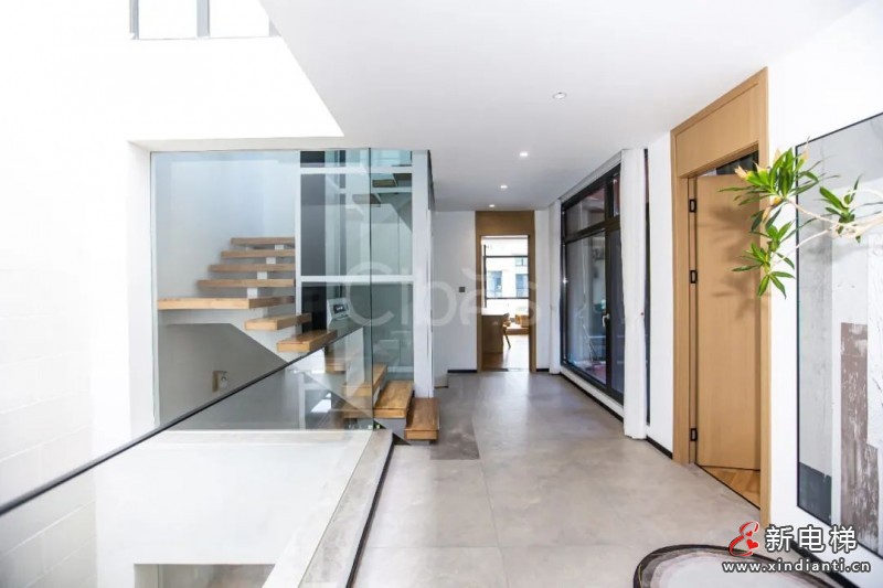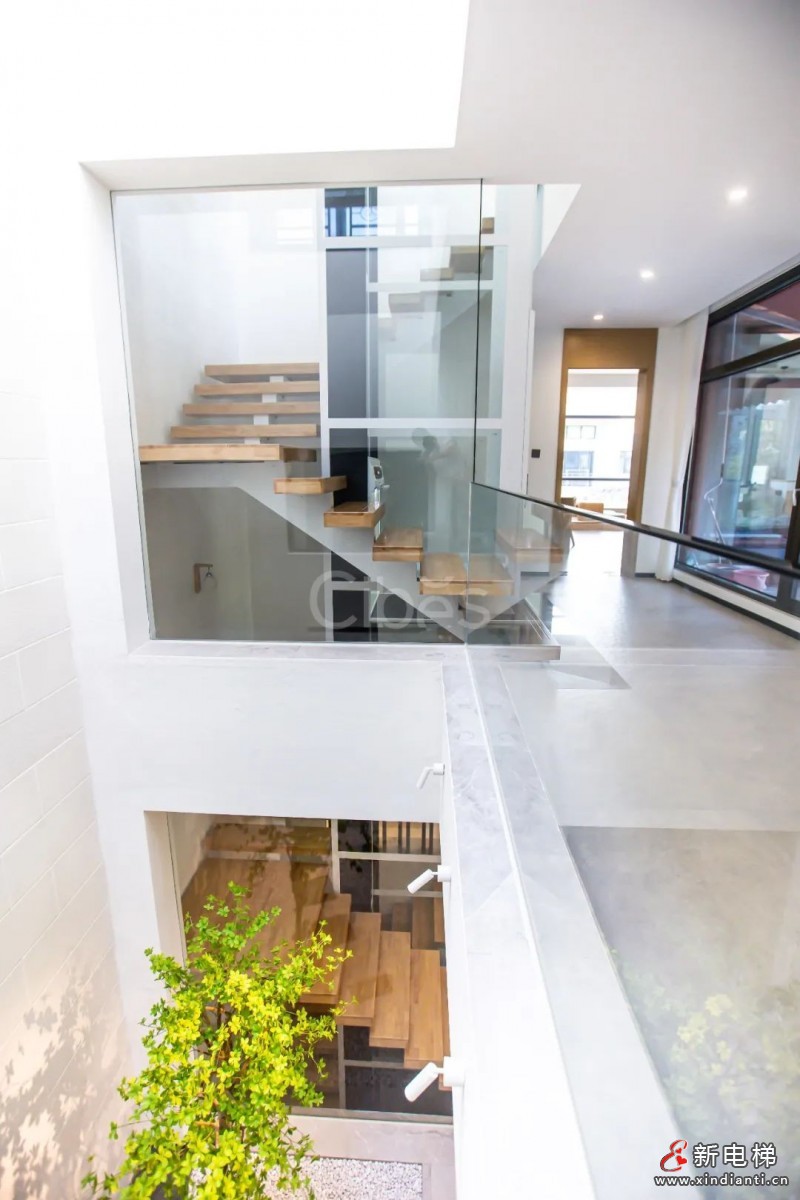 樓梯邊的采光井與四面玻璃的家用電梯是神來之筆,綠植的點綴為家居增添生機與活力。