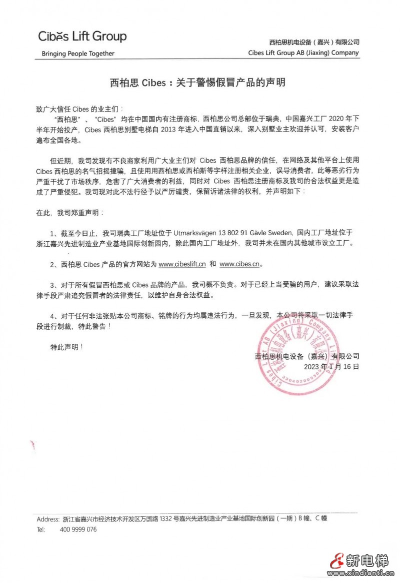 當前位置:首頁>電梯資訊 >電梯企業(yè)Enterprises>Cibes西柏思 | 關于警惕假冒產品的聲明